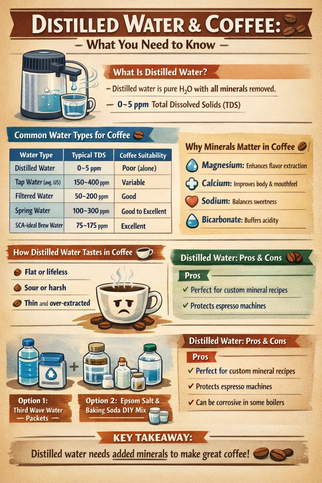 Tässä artikkelissa kerrotaan tarkalleen, mitä tapahtuu, kun käytät tislattua vettä kahviin, mitä tiede sanoo, miten veden tislaajat vaikuttavat asiaan ja mitkä vaihtoehdot antavat sinulle parempia tuloksia ilman arvailua.