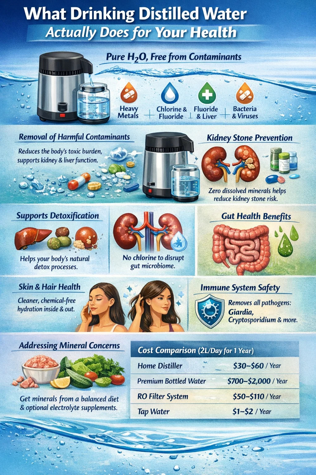Tässä artikkelissa eritellään erityiset, näyttöön perustuvat edut, käsitellään yleisiä huolenaiheita, kuten mineraalien häviäminen, ja selitetään, kuka hyötyy eniten kotivesitislaamon tuottamasta säännöllisestä juomavedestä.
