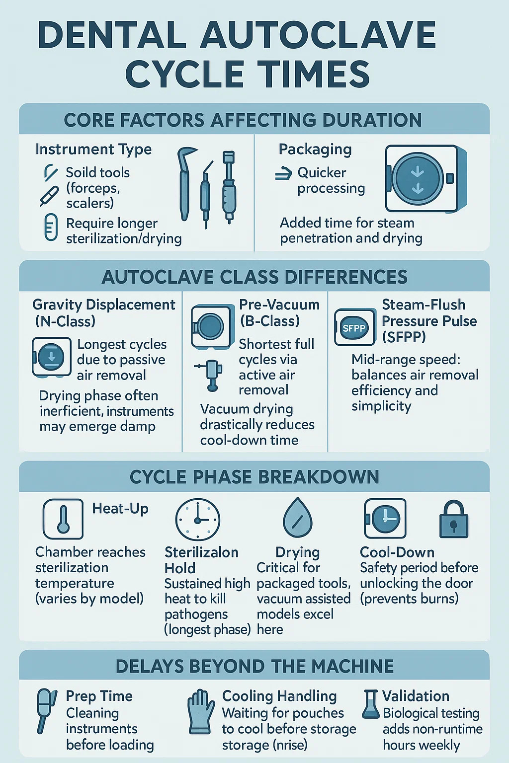 Tässä on erittely hammaslääkärin autoklaavi kiertoajat, keskittyen käytännön tekijöihin:
