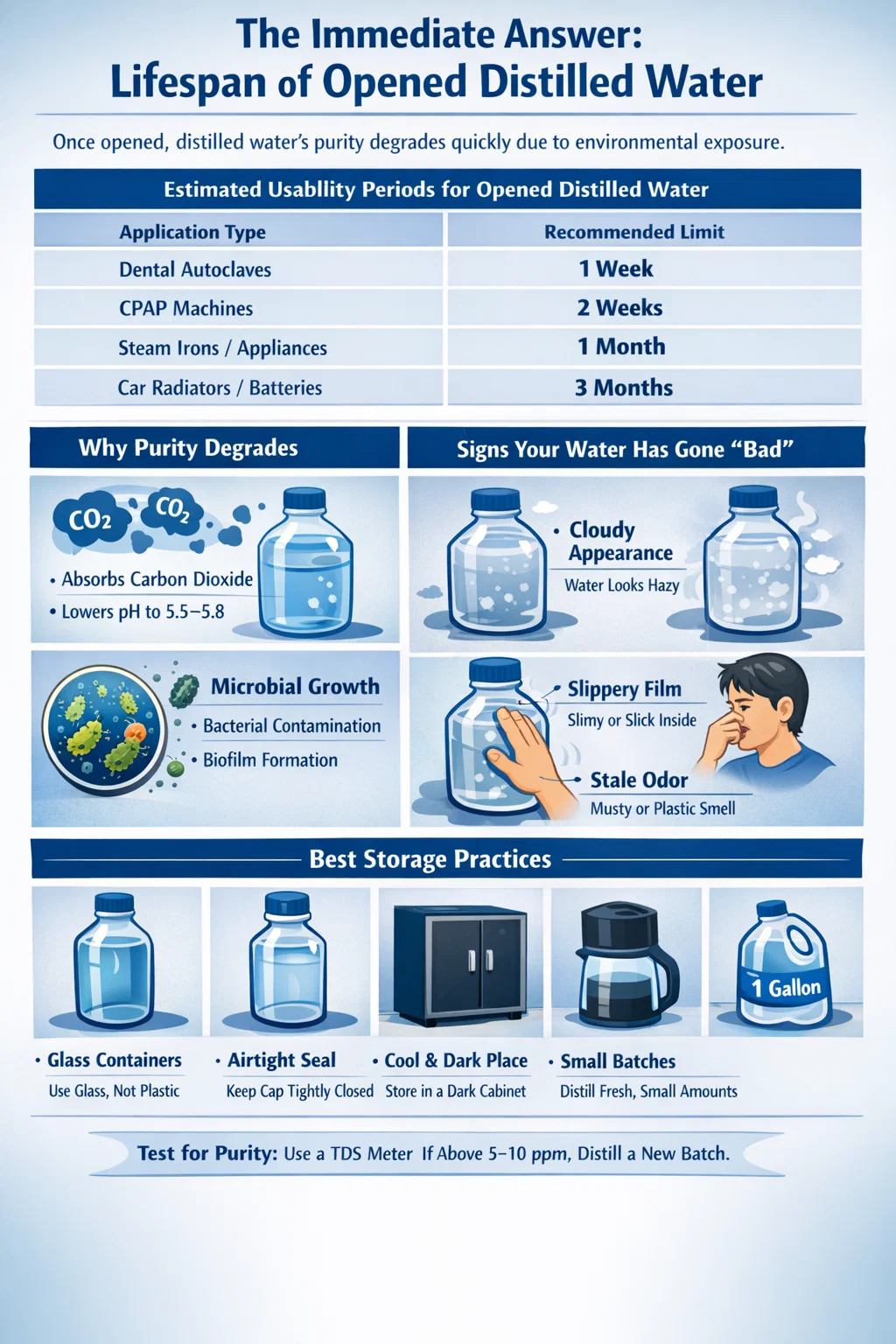 Kun tislattua vettä sisältävä pullo avataan, sen korkean puhtauden tila alkaa heikentyä ympäristölle altistumisen vuoksi. Lääketieteellisiin tai hammaslääketieteellisiin tarkoituksiin - kuten autoklaavissa käytettäväksi - avattu tislattu vesi kestää yleensä 7-14 päivää jos säilytetään oikein viileässä, pimeässä paikassa. Se voi jäädä käyttökelpoiseksi kodinkoneissa, kuten höyrysilitysraudoissa tai ilmankostuttimissa jopa 30 päivää . Vaikka vesi ei "pilaistu" samalla tavalla kuin ruoka, se imee aggressiivisesti hiilidioksidia ja ilmassa olevia hiukkasia, mikä voi muuttaa sen pH-tasoa ja tuoda mukanaan mikroskooppisia epäpuhtauksia, jotka heikentävät veden käytön hyödyt. veden tislaaja .