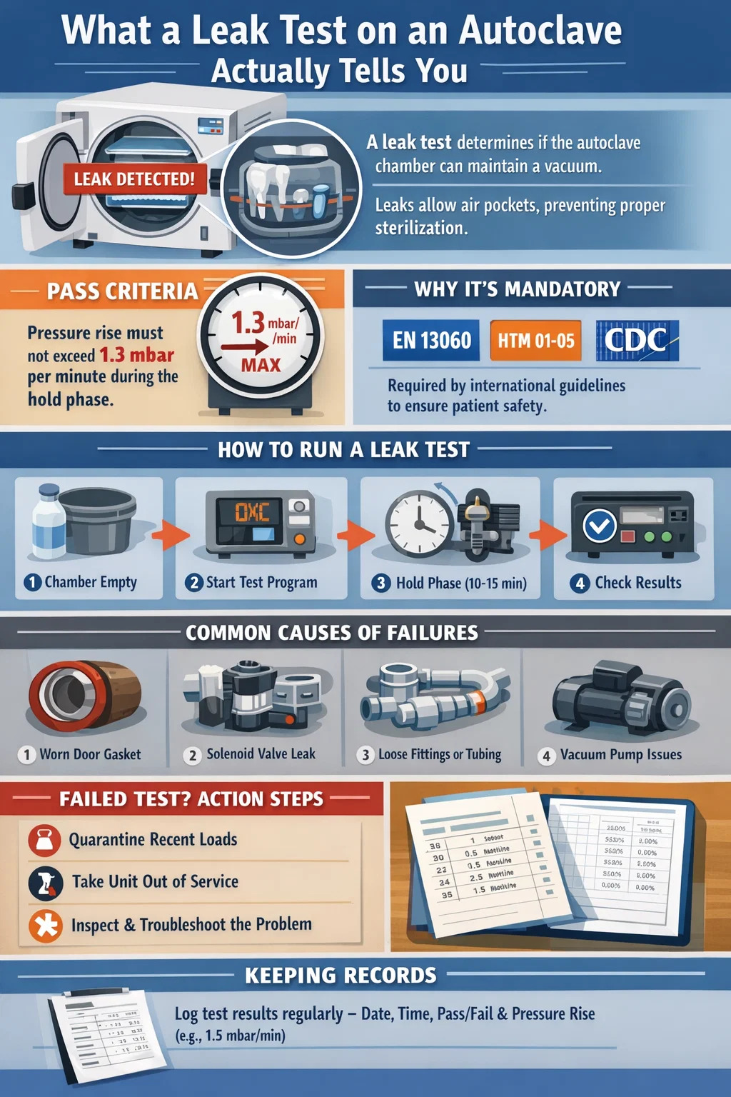 Vaatimustenmukaisuuden lisäksi on olemassa suora mekaaninen syy. Esityhjiöhammasautoklaavisyklit toimivat vetämällä sarja tyhjiöpulsseja ilman poistamiseksi ennen höyryn ruiskuttamista. Jos kammio vuotaa, jäännösilma muodostaa eristäviä taskuja instrumenttien ympärille. Höyryn lämpötila instrumentin pinnalla saattaa lukea oikein anturista, mutta todellinen kosketuslämpötila näissä ilmataskuissa voi olla 5°C - 15°C pienempi kuin kammion anturin lukema , mikä riittää jättämään biologiset indikaattorit haastamattomiksi ja patogeenit elinkelpoisiksi.
