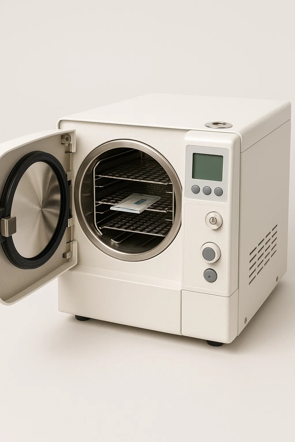 Erikoistunut lääketieteellinen laite, joka steriloi uudelleenkäytettäviä hammaslääketieteen instrumentteja korkeapaineisella kyllästetyllä höyryllä.
