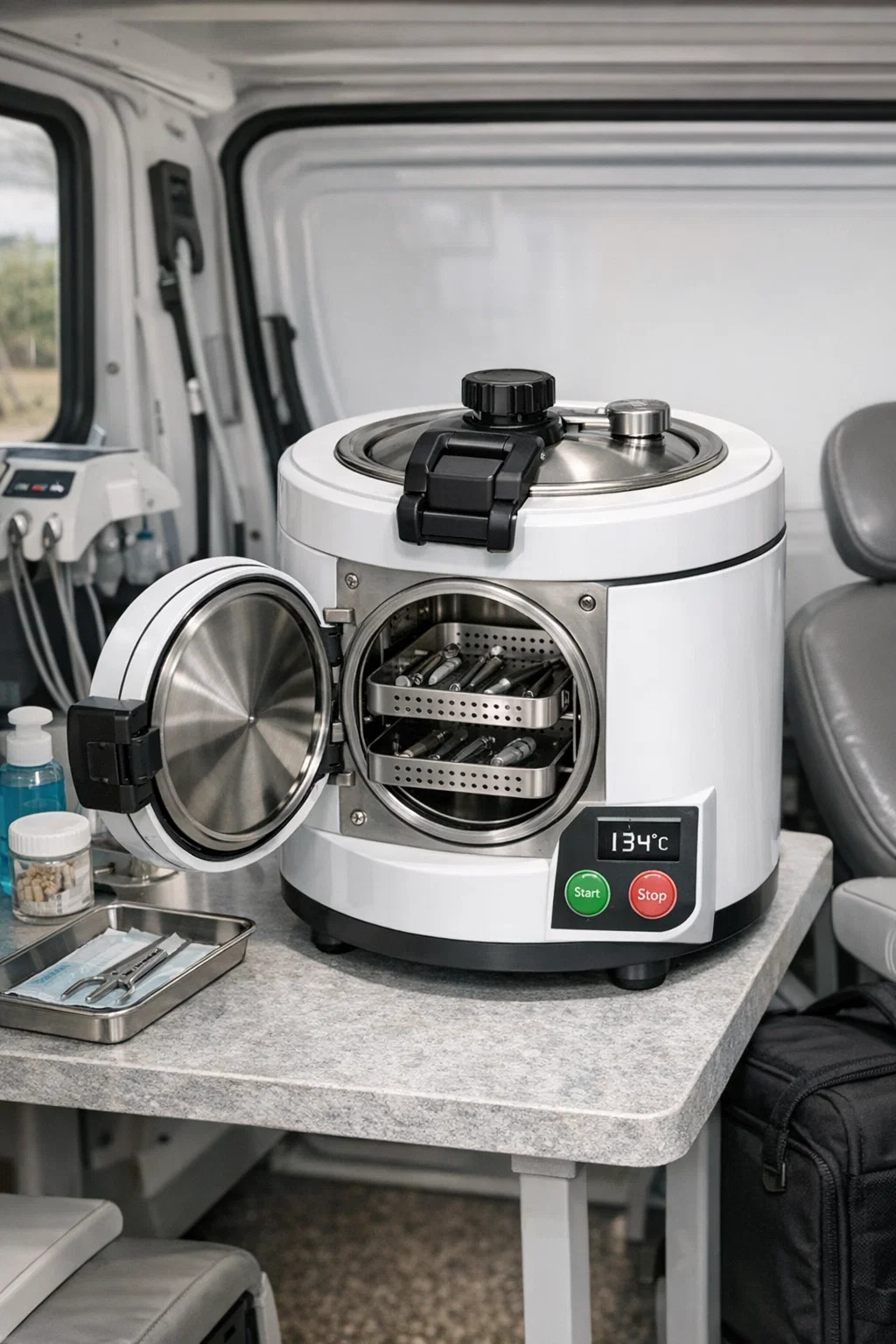 Varalaitteet: Se voidaan täyttää tilapäisesti, kun klinikan suuri kannettava hammaslääkäriautoklaavi ei toimi tai sitä korjataan, mikä varmistaa keskeytymättömän toiminnan.
