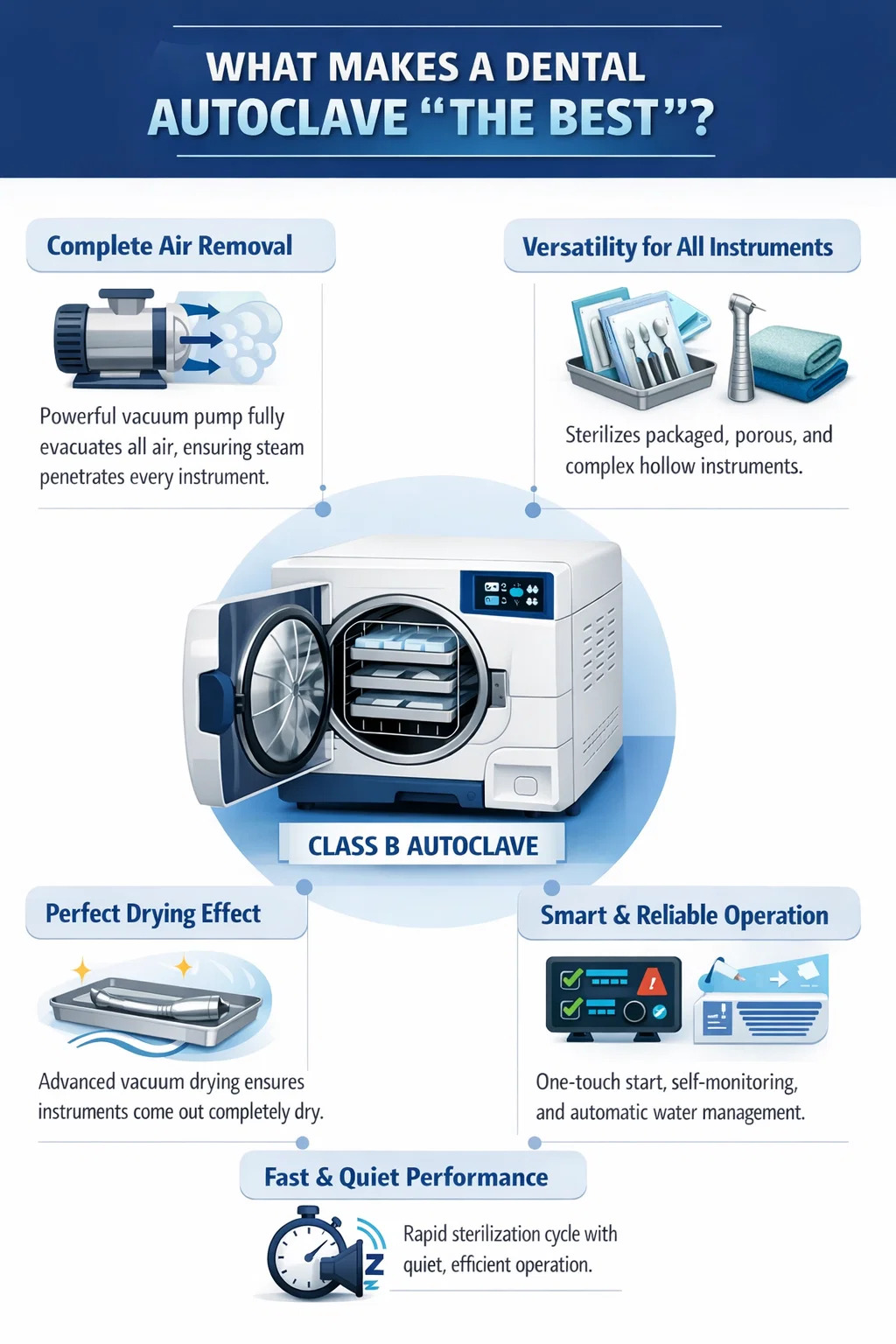 Hammasklinikoilla ei ole yhtä "maailman parasta" mallia, mutta yleisesti hyväksytty paras valinta viittaa yleensä Luokan B hammasautoklaavit joka pystyy käsittelemään erilaisia monimutkaisia tilanteita ja tarjoamaan vakaimman suorituskyvyn.